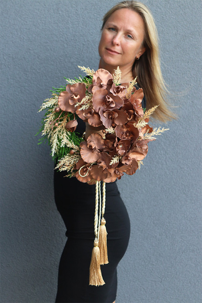 Piękny, egzotyczny wianek z urodziwą orchideą w roli głównej, zaplecioną na wiklinowym podkładzie, Towarzyszą jej pióropusze trawy pampasowej i zielonej tui. Wianek odzwierciedla klasyczną elegancję, a miedziane barwy tworzą dostojną aurę.