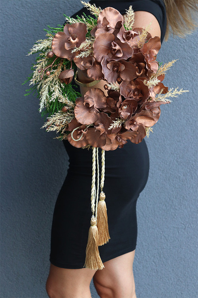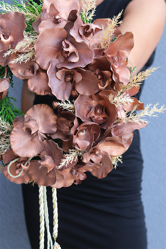Piękny, egzotyczny wianek z urodziwą orchideą w roli głównej, zaplecioną na wiklinowym podkładzie, Towarzyszą jej pióropusze trawy pampasowej i zielonej tui. Wianek odzwierciedla klasyczną elegancję, a miedziane barwy tworzą dostojną aurę.