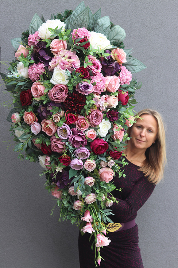 Piękna wiązanka nagrobna na sztucznej igle została ułożona w tonacji różowego fioletu z kwiatów róż, hortensji, pięknej eustomy. Ta pełna kwiatów kompozycja jest wyjatkowo efektowną i przyciągającą uwagę kolorystyką i doskonałym kształtem dekoracją. Wiązanka suto wypełniona piękną zielenią różnorodnych liści, pędami barwinka i eukaliptusa, gustownie wkomponowanych w całość.