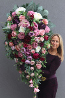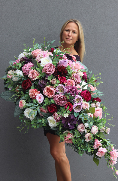 Piękna wiązanka nagrobna na sztucznej igle została ułożona w tonacji różowego fioletu z kwiatów róż, hortensji, pięknej eustomy. Ta pełna kwiatów kompozycja jest wyjatkowo efektowną i przyciągającą uwagę kolorystyką i doskonałym kształtem dekoracją. Wiązanka suto wypełniona piękną zielenią różnorodnych liści, pędami barwinka i eukaliptusa, gustownie wkomponowanych...