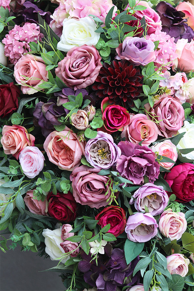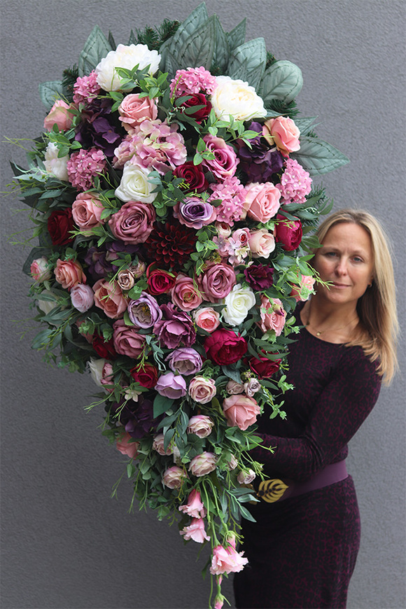 Piękna wiązanka nagrobna na sztucznej igle została ułożona w tonacji różowego fioletu z kwiatów róż, hortensji, pięknej eustomy. Ta pełna kwiatów kompozycja jest wyjatkowo efektowną i przyciągającą uwagę kolorystyką i doskonałym kształtem dekoracją. Wiązanka suto wypełniona piękną zielenią różnorodnych liści, pędami barwinka i eukaliptusa, gustownie wkomponowanych w całość.