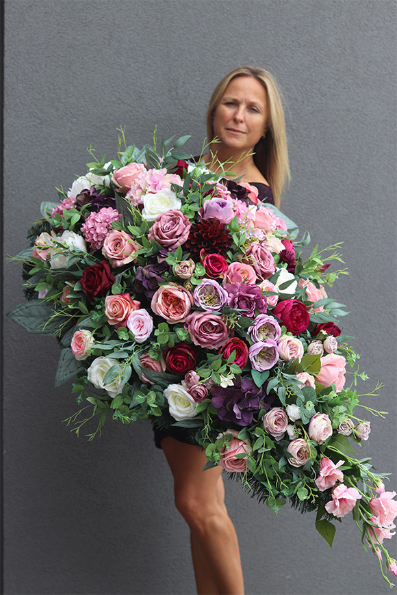 Piękna wiązanka nagrobna na sztucznej igle została ułożona z delikatnie różowych i amarantowych róż, bladofioletowych kwiatostanów hortensji bukietowej, dalii ogrodowych i eustomy. Jest wyjatkowo efektowną i przyciagajacą uwagę kolorystyką i doskonałym kształtem dekoracją. Wiązanka suto wypełniona piękną zielenią różnorodnych liści, gustownie wkomponowanych w całość.
