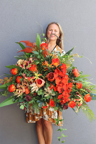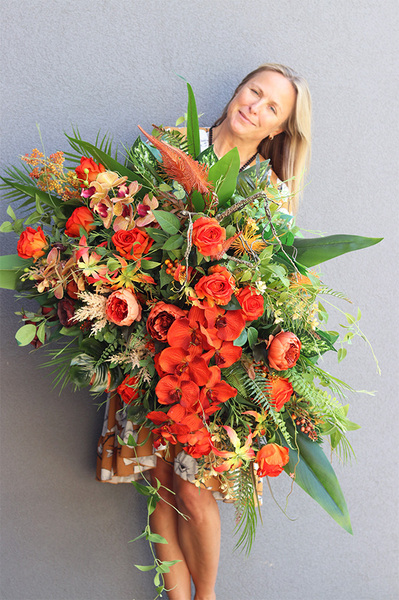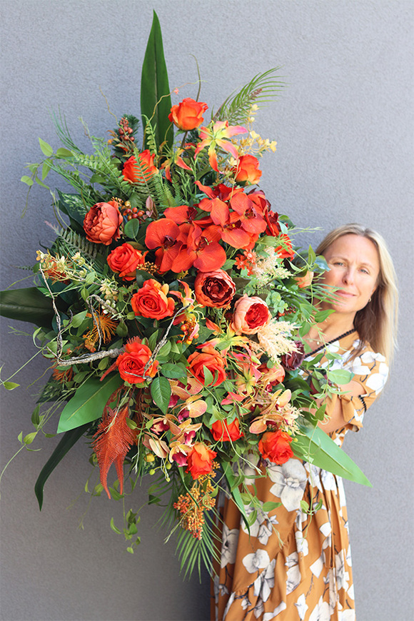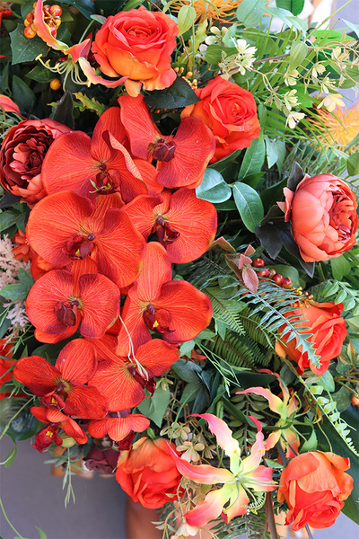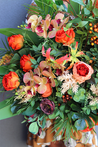 Orangita to elegancka kompozycja pełna wyszukanych, wysokiej jakości sztucznych róż i peonii w odcieniach oranżu, egzotycznej orchideii i trytomy. Wiązanka jest gustownie skomponowana na podkładzie ze sztucznej igły, wzbogacona zielonymi liśćmi bananowca, paproci, opadającymi pędami jasnozielonego barwinka, liśćmi palmy kokosowej i pióropuszami suchych traw.