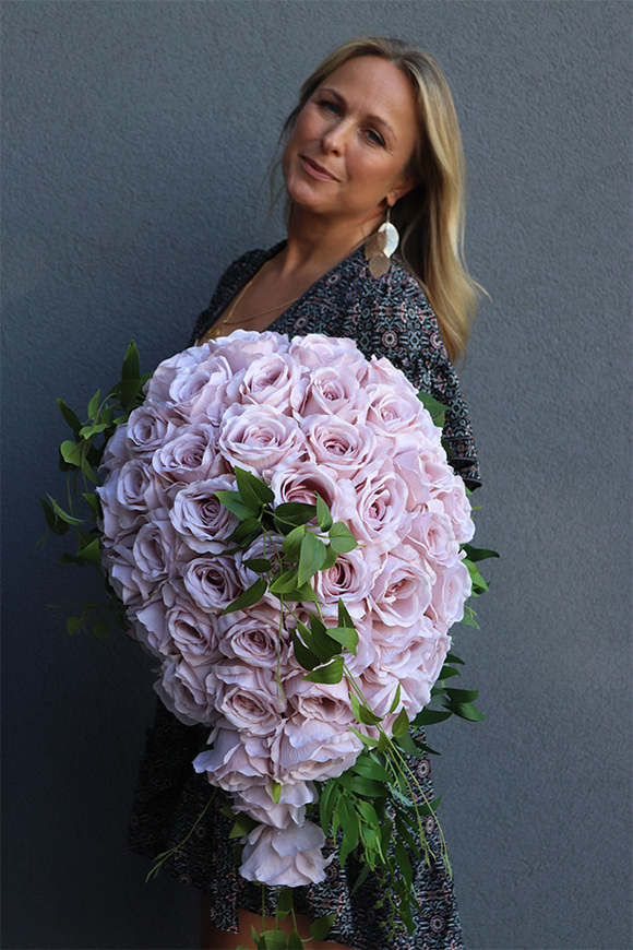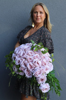 Zachwycająca wiązanka nagrobna w kształcie łezki, utkana z bladofioletowych róż na bazie delikatnych, zielonych listków, z romantyczną gałązką spadającego nostalgicznie barwinka. Kompozycja tworzy aranżację wyróżniającą się na każdym pomniku.