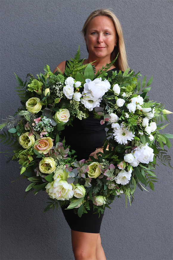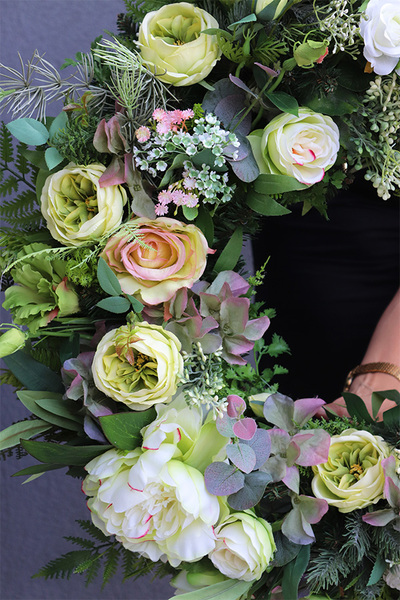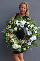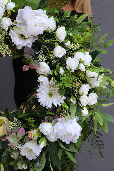 Okazały, elegancki wieniec na bazie wielorakich liścii, m. innymi ruskusa i paproci. Wieniec utrzymany w soczystych, naturalnych barwach, bieli i delikatnej zieleni kwiatów róż, eustomy, peonii i gerbery. Lekkości dodają utkane swobodnie baldachy białego kopru.