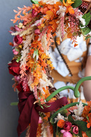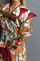 Zachwycająca kompozycja z kwiatów w tonacji eleganckiego zestawienia koloru bordo, pomarańczu i ecru, ułożona z pięknych kalli, pióropuszy suchych traw i sukulentów na podstawie z brązowej, naturalnej wikliny. Całość ujęta szeroką wstążką. Kompozycj...