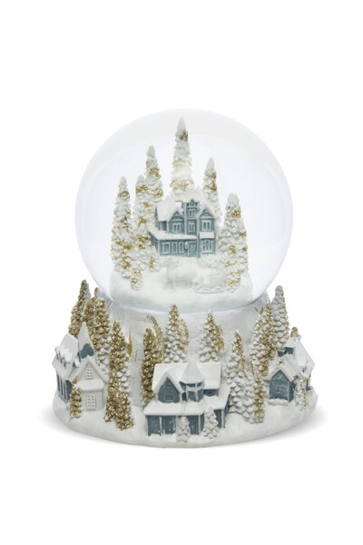 Wewnątrz szklanej kuli, wypełnionej sztucznym śniegiem, znajduje się scenka ze starym dworem w ośnieżonym lesie. Pięknie zdobiona podstawa stanowi kontynuację scenki.